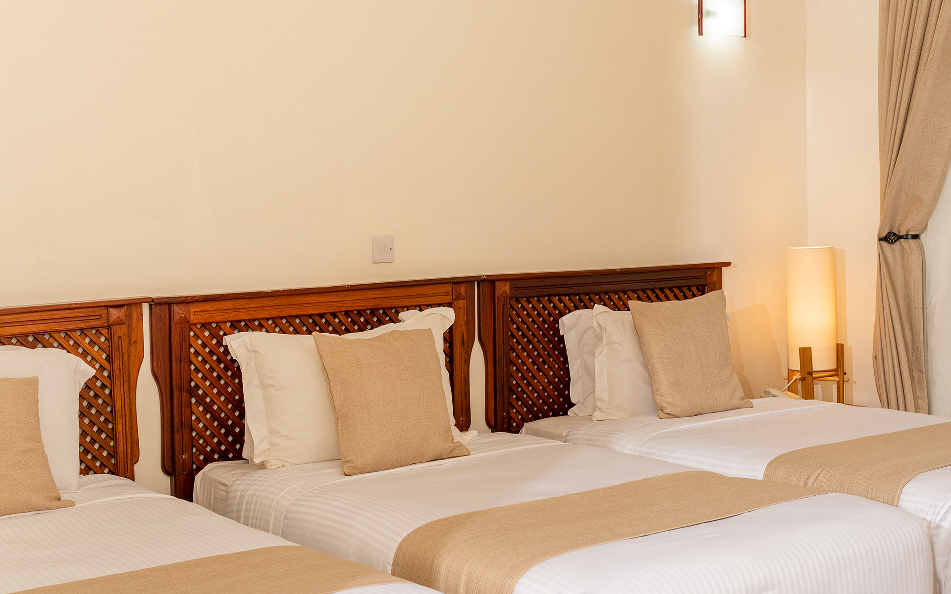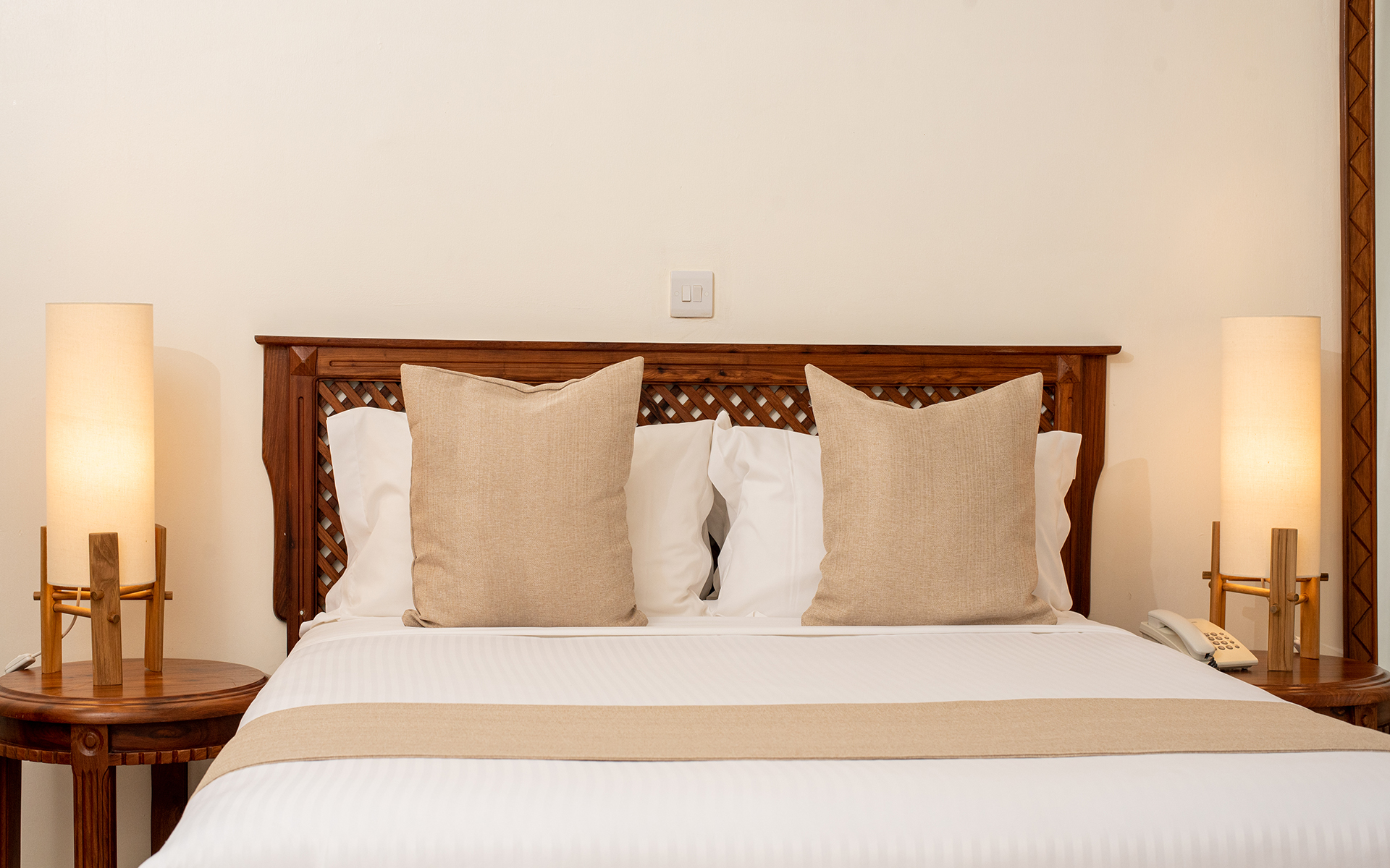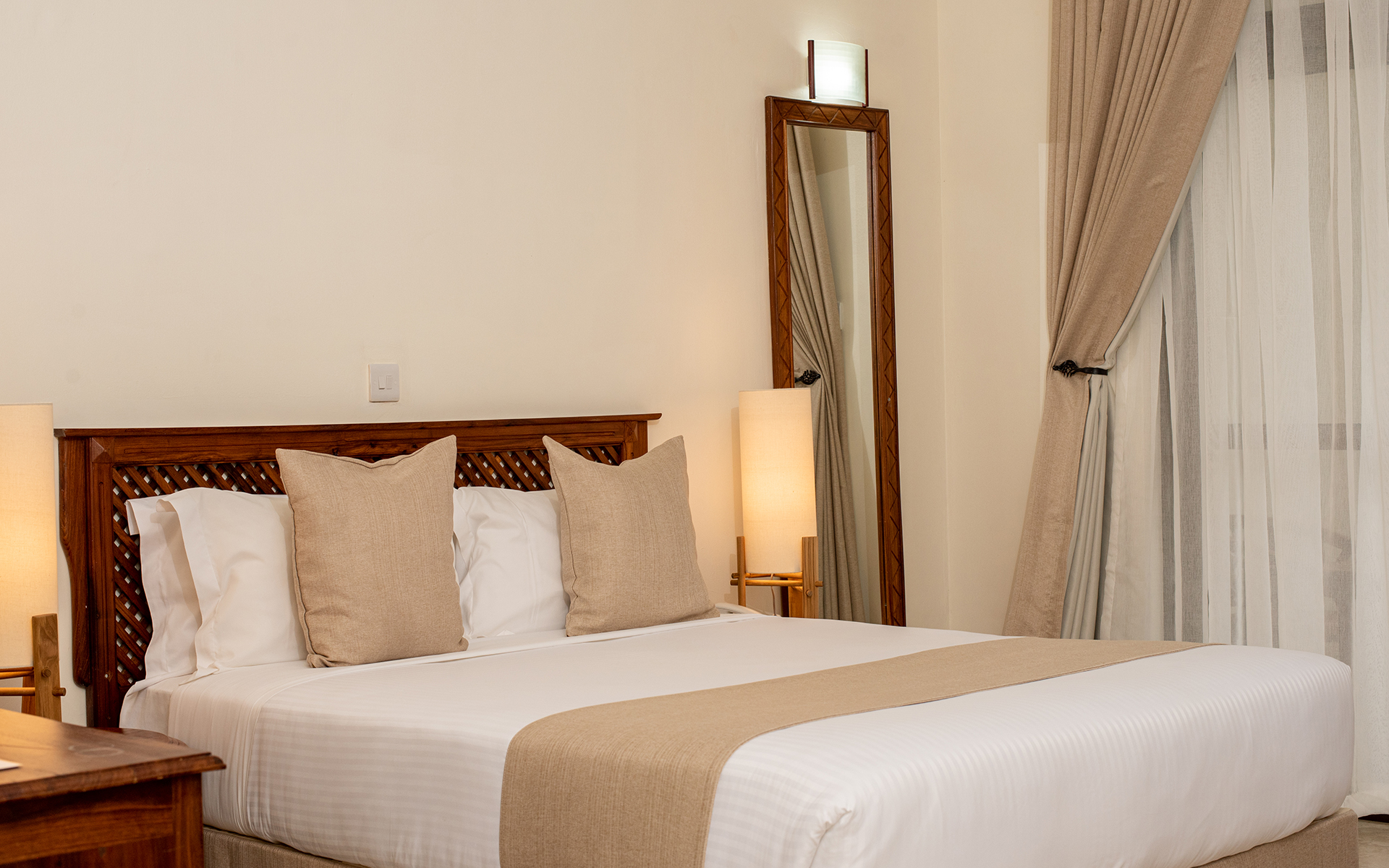 En suite bathroom with hairdryer; Telephone; Air Conditioner; Wireless Internet; Cable TV; Bedside Table Lamp; Bottled Water; Wardrobe Closet; Tea & Coffee Station; Mini Fridge; Safe Deposit box; Work Desk; Toiletries; Bathrobes & Slippers.